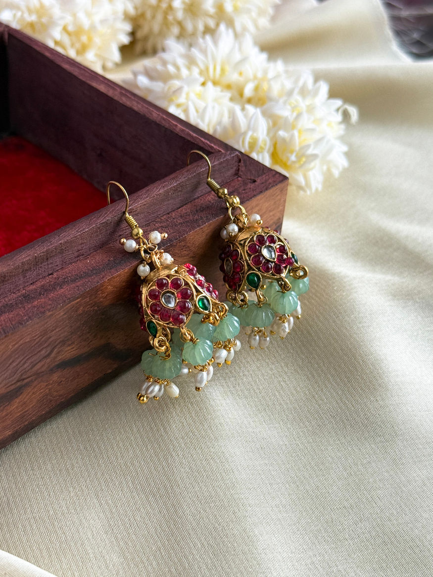 A premium pastel green-ruby hanging jhumka, crafted with timeless elegance and festive charm, perfect for special occasions.